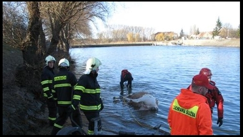 Dva utonulé koně v sobotu hasiči s Vodní záchrannou službou vytahovali z řeky Dyje u jezu v centru Břeclavi. K řece do ulice U...
