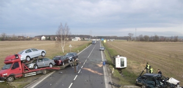 Podle svědků nezvládla řidička osobního auta předjíždění dlouhé soupravy s přepravovaným nákladem nových osobních aut, když došlo k těžkému střetu s protijedoucím tranzitem a k zachycení jak soupravy, tak i dalšího vozu. Při nehodě utrpěla řidička prvního auta středně těžké zranění a lehká zranění byla na místě evidována u řidičů dalších osobních aut.