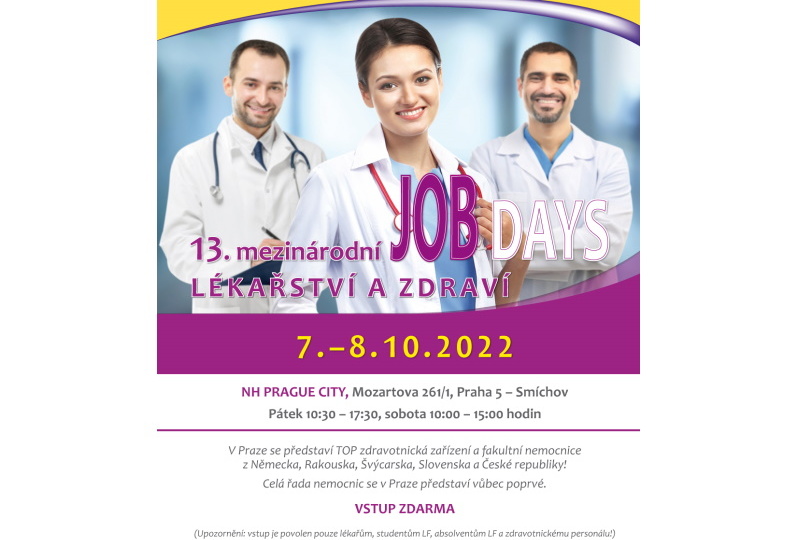 Letošní Mezinárodní job days, které proběhnou v Praze ve dnech 7.-8. října 2022, otevírají své brány s novým rekordním počtem vystavovatelů. "Na akci se představí 36 špičkových nemocnic a zdravotnických zařízení z Německa, Rakouska, Švýcarska, Slovenska a České republiky. Poprvé se pod jednou střechou uskuteční hned 3 akce - 13. Mezinárodní job days lékařství a zdraví, 8. Mezinárodní job days pro zdravotnický a pečovatelský personál a nově 1. Mezinárodní job days pro fyzioterapii a ergoterapii. Na job days srdečně zveme všechny lékaře, čerstvé absolventy a studenty lékařských fakult, zdravotní sestry a bratry, pečovatelský personál a ergoterapeuty a fyzioterapeuty, aby se přišli informovat na své pracovní možnosti v zastoupených 5 zemích.“ V rámci doprovodného programu se každý den uskuteční velká tombola o skvělé ceny, které se odborní návštěvníci mohou zúčastnit zcela zdarma.