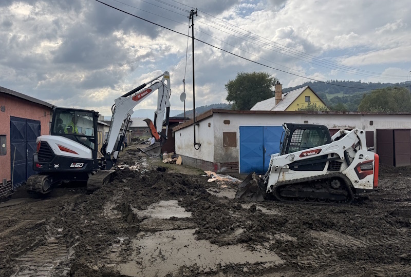 Výprava strojů s posádkou zahrnující smykem řízený pásový nakladač T590 a minirypadlo E60 zde zásadně pomáhá při pracích na likvidaci následků ničivých povodní. Společnost navíc zapůjčila tři další nakladače Hasičskému záchrannému sboru v Olomouci. Jedná se o dva smykem řízené kolové nakladače S650 a S630 a o jeden pásový nakladač T450. Stroje Bobcat budou následující měsíc bezplatně pomáhat hasičům v Olomouckém kraji převážně v Jeseníku a jeho okolí s odklízením naplavených materiálů a dalšími činnostmi.