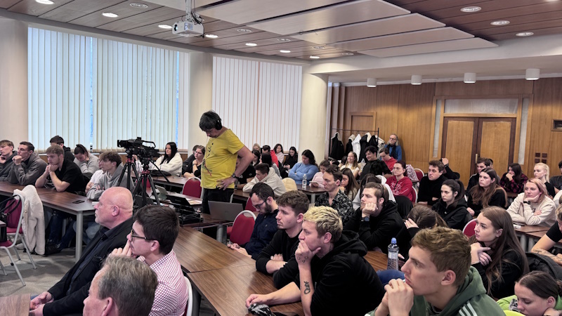V publiku usedli studenti tamní Vysoké školy evropských a regionálních studií, univerzitu představil rektor Jiří Dušek.