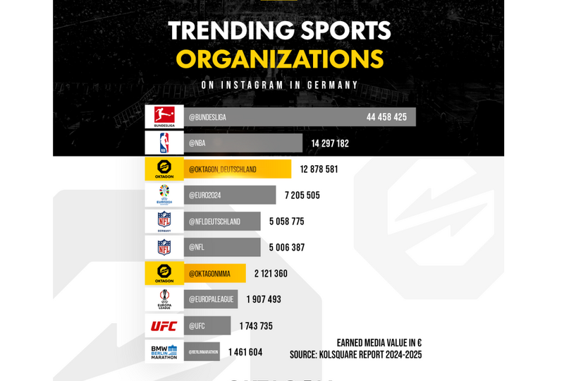 Praha 26. června 2025 (PROTEXT) - OKTAGON byl zařazen mezi nejvlivnější sportovní organizace na německém trhu. Podle aktuální zprávy datové analytické platformy Kolsquare, která pokrývá období od dubna 2024 do dubna 2025, se česko-slovenská organizace smíšených bojových umění umístila na 3. místě mezi všemi sportovními soutěžemi na Instagramu v Německu – hned za Bundesligou a NBA.