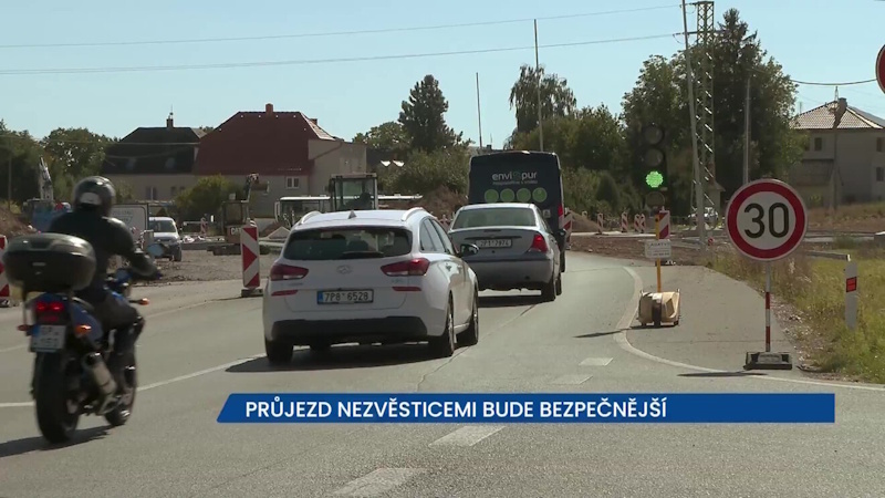 Práce na druhé polovině nové okružní křižovatky omezují provoz na příjezdu do obce, kde je doprava vedena kyvadlově již hotovou první polovinou křižovatky. Provoz je řízen semafory.