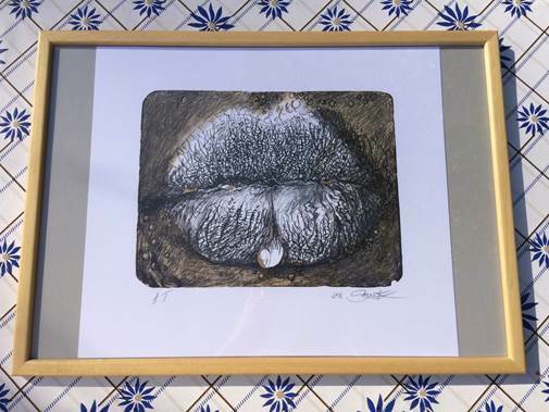 Přestože Jan Saudek proslul jako světoznámý fotograf, je rovněž uznávaným malířem. Malby, které tvoří, bývají inspirovány jeho fotografiemi a obraz Marie č. 1 není výjimkou. Také umělcův první litografický počin, který vznikl v roce 2020, vychází z ikonické fotografie z roku 1974 a předkládá sytě rudé rty smáčené modrými kapkami vody.