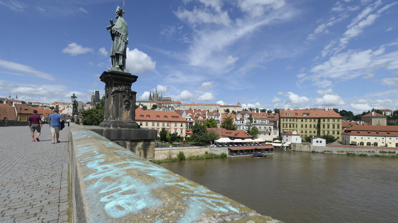 Neznámý vandal posprejoval část Karlova mostu. Modré nápisy v angličtině jsou na pravé straně zábradlí i na podstavci sochy směrem k Pražskému hradu asi od poloviny mostu.