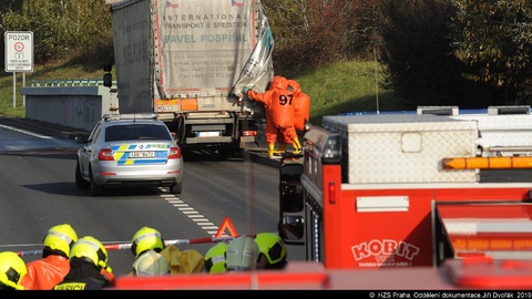 Na frekventovanou ulici K Barrandovu v Praze 5 se po nehodě nákladního automobilu vylily chemikálie, zejména kyselina solná.