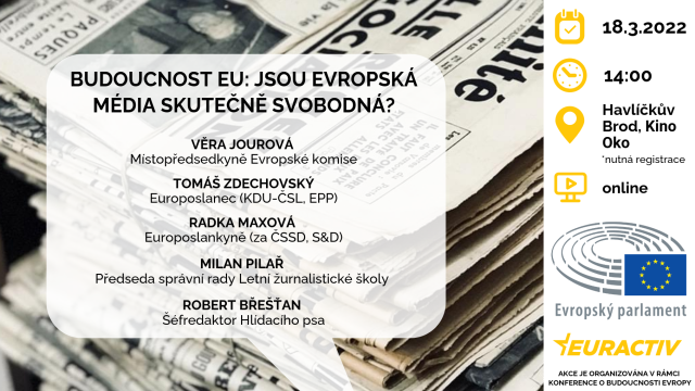 Kancelář Evropského parlamentu ČR ve spolupráci s portálem EURACTIV.cz. pořádá v pátek 18. března debatu o stavu a budoucnosti médií, které se zúčastní místopředsedkyně Evropské komise Věra Jourová, poslankyně Evropského parlamentu (za ČSSD, S&D) Radka Maxová, poslanec Evropského parlamentu (KDU-ČSL, EPP) Tomáš Zdechovský, předseda správní rady Letní žurnalistické školy Milan Pilař a šéfredaktor portálu Hlídací pes Robert Břešťan. Diskuse začne ve 14:00 a moderovat ji bude šéfredaktorka EURACTIV.cz Aneta Zachová.