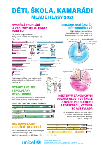 Česká pobočka UNICEF zveřejnila druhou část dat z výzkumu Mladé hlasy 2021. Unikátní sociologická studie, která od roku 2001 proběhla již popáté, mapuje názory, postoje a očekávání českých dětí. Odpovědi na otázky zaměřené na školu a kamarády prozradily, jaké mají děti vztahy s opačným pohlavím, jak je pro ně obtížné mluvit ve škole o problémech nebo jak moc jsou mezi jejich přáteli a známými rozšířeny návykové látky. Nezanedbatelnou roli v těchto oblastech často hraje finanční situace rodiny, podobně jako v kategorii štěstí, kterou UNICEF zveřejnil 21. října.