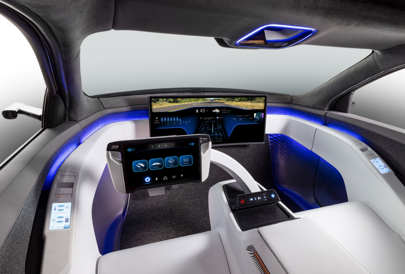 Modul sedadla Smart Cabin je neoddeliteľnou súčasťou konceptu EVI. Kombinuje dve predné sedadlá s integrovanou podlahovou konzolou, vstupným systémom elektronického riadenia „steer-by-wire“, HMI, displejmi, bezpečnostnými pásmi a airbagmi, ako aj pohodlným systémom mikroklímy HVAC. Systém elektronického riadenia má integrovaný displej, ktorý možno „odložiť“ na umožnenie interakcie počas autonómnej jazdy alebo ho presunúť do polohy riadenia pre jazdné funkcie v závislosti od požadovaného jazdného režimu. Vďaka zobrazovaciemu rozhraniu HMI, ktoré je plne zabudované do vysúvateľného ramena elektronického riadenia, už veľký panel displeja v prednej časti kabíny nevyžaduje žiadnu dotykovú interakciu.