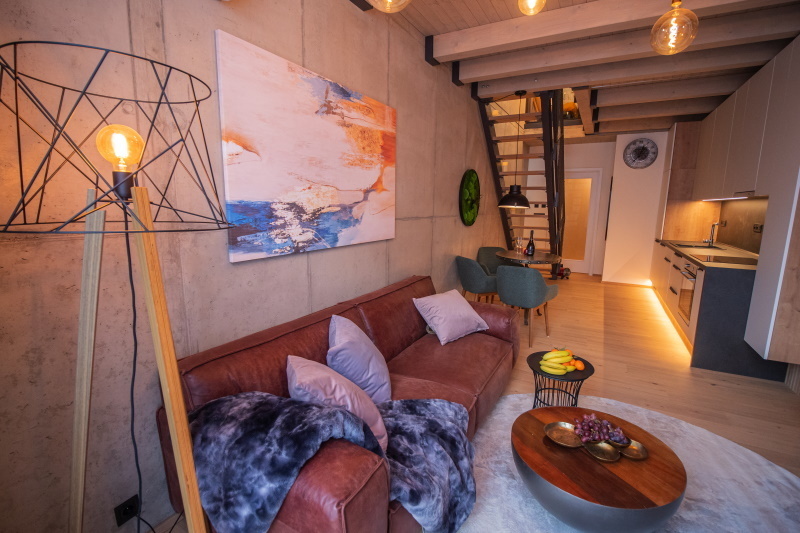 Vzorový loftový byt je vybaven jak moderními interiérovými prvky od českých i zahraničních značek, tak zakázkovým industriálně laděným nábytkem rokycanského ARTTECH studia, za kterým stojí BcA. Petr Janda. Propojení prostoru zajišťuje vestavěné LED osvětlení v kombinaci se starými průmyslově laděnými stínícími lampami. Využité dřevěné prvky v podobě pracovního stolu z teakového dřeva a nočních stolků z jilmu v interiéru spojují přírodní tvary a industriální hrubost. Kus přírody do vzorového bytu přináší také mechový obraz, v jehož kontrastu působí obraz abstraktní. Ten svojí barevnou hrou oživuje interiér.