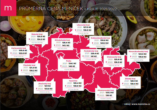 Praha 28. prosince 2022 (PROTEXT) - Průměrná cena poledních meníček opět na vzestupu. Meziroční srovnání 2021/2022 vykazuje změnu ve výši 12,2 Kč, což odpovídá (+8,9 %). Tak vyplývá z analýzy obědového serveru menicka.cz. Ten ve svém pravidelném bilancování zohlednil svou databázi - téměř 6000 gastronomických provozoven napříč Českou republikou.