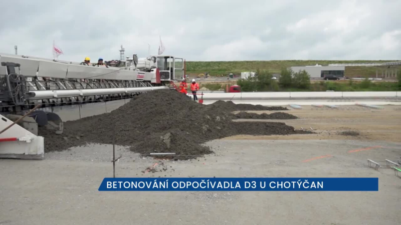Jan Studecký, tiskový mluvčí Ředitelství dálnic a silnic: "Za námi aktuálně probíhá pokládka cementobetonového krytu. Až to vytvrdne, tak to bude sloužit jako odstavovací místo pro nákladní automobily. Kdyby tady byl asfalt, tak bychom tady měli brzy vyjeté koleje. Je to oboustranná odpočívka, osm míst pro autobusy."