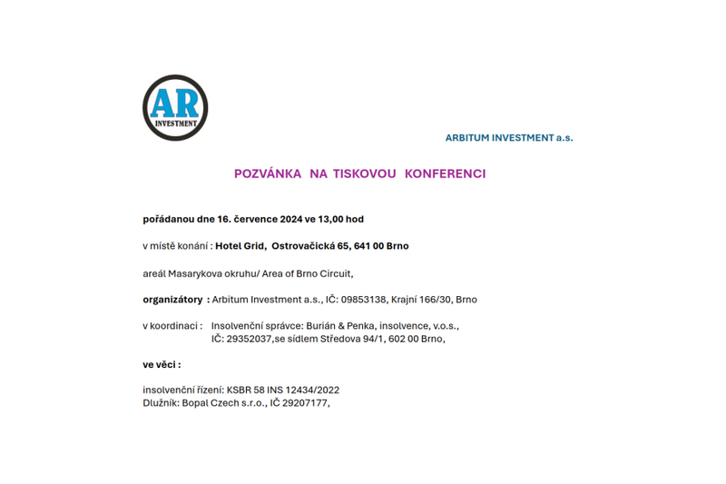organizátory: Arbitum Investment a.s., IČ: 09853138, Krajní 166/30, Brno, Veronika Suchánková, předseda správní rady,