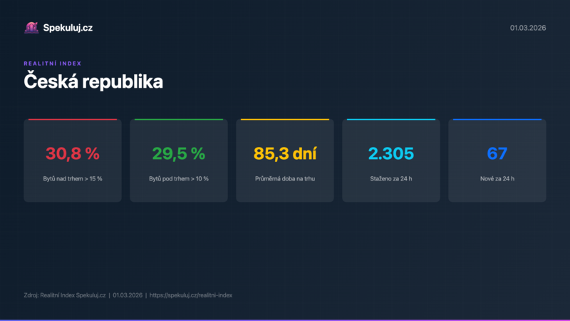 Praha 2. března 2026 (PROTEXT) - Podle aktuálních dat Realitního Indexu Spekuluj.cz je v Praze 30,5 % bytů inzerováno nad tržní cenou o více než 15 %, zatímco dalších 33,0 % nabídek je pod trhem o více než 10 %.